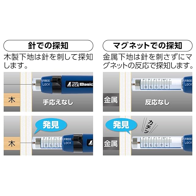 針の場合:壁厚35mmまで使用可能 マグネットの場合:壁厚13mm、天井厚12mmまで使用可能 ※石膏ボード裏の鉄材を探す場合、マグネットの使用範囲は、条件によって代わります。