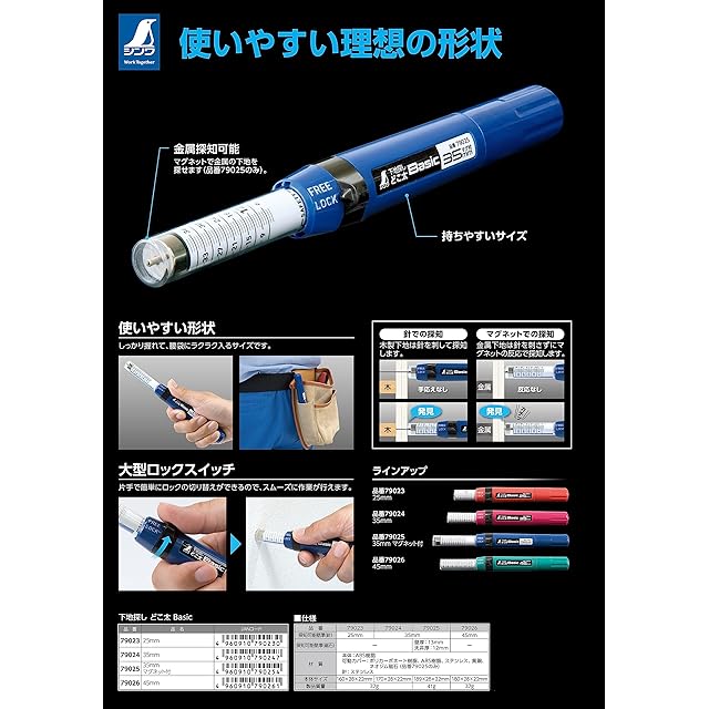 シンワ測定(Shinwa Sokutei) 下地探し どこ太 Basic 35mm 石膏ボード用の針式の下地探し マグネット付 79025