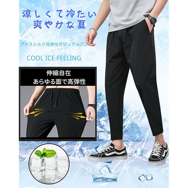 [foveitaa] 接触冷感 パンツ メンズ 9分丈 夏 ゆったり ストレッチ 薄手 イージーパンツ 大きいサイズ アイスシルク 清涼 涼しい 涼感 通気性 吸水速乾 快適 ボトムス ズボン エアパンツ black-XL