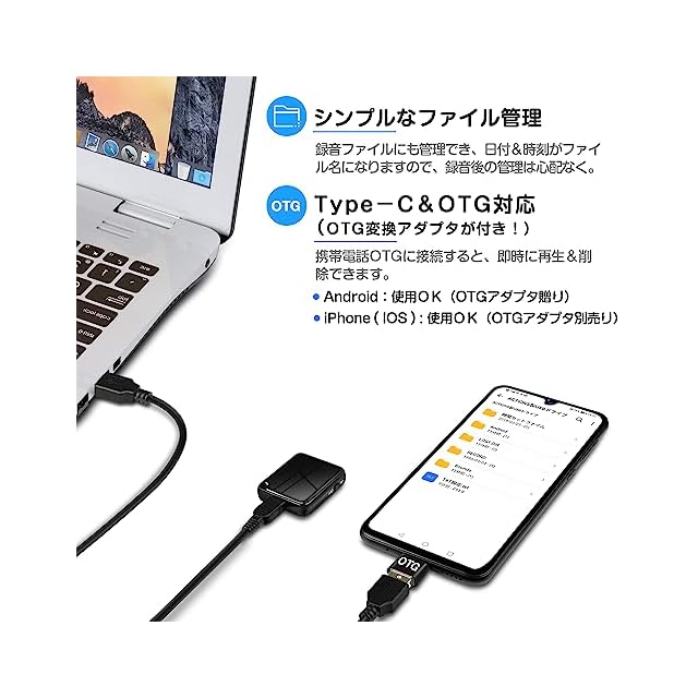 【ワンタッチで録音開始!】録音ボタンを押すだけ、簡単に録音始めます。複雑手順なし、大切な内容を一刻も早く記録できます!タイムスタンプ機能があるので、録音の際に、日時が自動に記録されます。録音ファイルにも管理でき、日付&時刻がファイル名になりますので、録音後の管理は心配なく。ファイル名は日付と開始時間でつけられるので確認の際の一目でわかり、便利です。パソコンとダイレクトに接続すれば、音声や音楽ファイル、データを転送、バックアップできます。