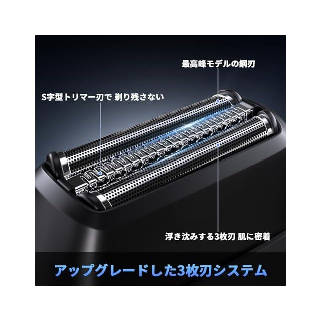 【3Dフローティングブレード&高速モーター】往復式電動ひげそり 、上下・左右に振動する独立フローティング3刃ヘッドを採用し、顔の輪郭の曲面や小さなうねり、首やあごに自動的にフィットし、肌への負担を軽減する。超薄型ステンレス製の金属製ブレードと高速モーターを使用した電気かみそりは、パワフルで深く剃ることができます。
