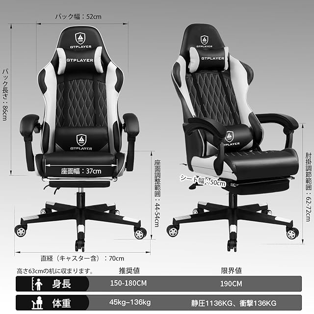 GTPLAYER ゲーミングチェア 白 デスク pcチェア 椅子 テレワーク 145°リクライニング オットマン付き ゲームチェア ハイバック ランバーサポート ポケットコイルが内蔵 PUレザー GTPlayerシリーズ GTP900