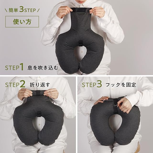 【簡単に空気を入れられる】口をつけずに膨らみ、小さくたためるネックピロー。息を吹き込み、折り返し、フックを固定するだけですぐに使えます。首を包み込み、しっかり支えるかたち。空気の量で好みの固さに調整できます。