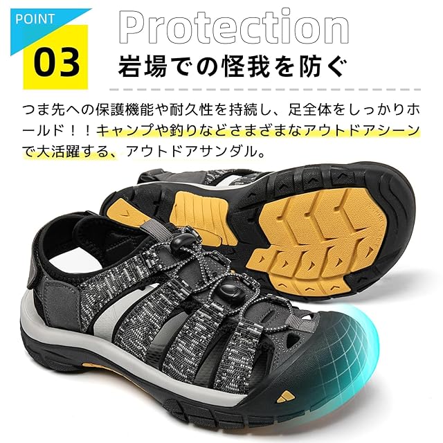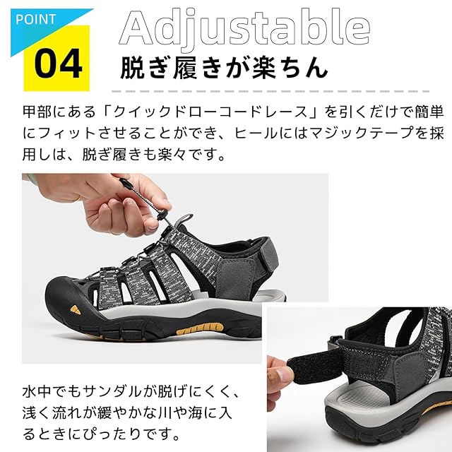 【高機能をファッショナブルに】シンプルなデザインなので、耐久性・快適性に優れた アウトドア アイテムを日常的に楽しめます。スニーカー とも一線を画す、新たなカジュアル・シューズとしての提案です。日常生活はもちろん、タウンユースや旅行先、リゾート地、アウトドアなど、さまざまなシーンで活躍するスポーツサンダル。キャンバス、散歩、運動、ランニング、ドライビング、水遊び、海水浴、お出掛け、アウトドアシーン、や川遊び、ビーチ、マリンスポーツ、ジムなどでもの場合まで、簡単コーデできます。