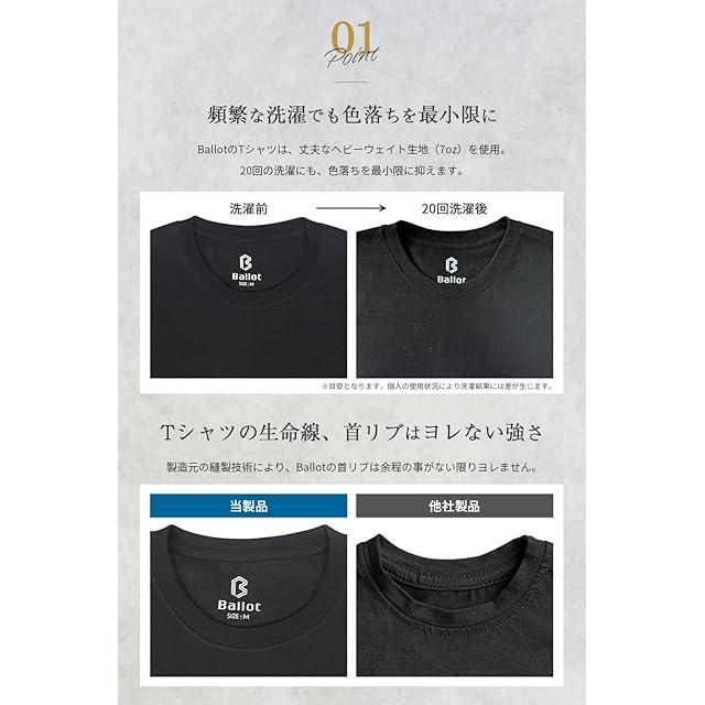 【品質3要素で安心の着心地】ヨレない、透けない、長持ちする3つの特長を兼ね備えたTシャツです。多くの無地Tシャツでは、薄さが気になり1枚で着るのが不安という声もありますが、BALLOTのTシャツは7ozの程よい厚みを実現。適度な生地感で透けにくく、洗濯後も型崩れしにくい設計が特徴です。日常使いに最適な耐久性で、長く愛用いただけます。
