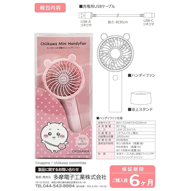 多摩電子工業 ちいかわハンディファン SQ-SK121CB-C (ちいかわ チェリーブロッサム) シリコン製の耳カバー 取外し可能 スタンド付属 風量調整機能 軽量&コンパクト手持ち扇風機 卓上扇風機 USB充電 Type-C対応
