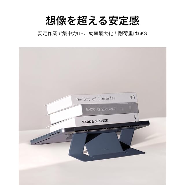 【厳選素材・重さに耐久】特製したポレウリタンとファイバーグラス素材と巧みな折り畳みデザインと組み合わせ、超軽量・超薄型で高強度・高安定性を実現します。耐荷重は最大5kg、作業時の安定・安全な支えを提供いたします。*ご注意:パソコンスタンドをご使用の際、キーボードの周りを叩くとパソコンが揺れるという意見を頂きました。この件について、実際に使用した場合を検討し、作業時両手を自然にキーボード上に置くと揺れることはないのでご安心ください。