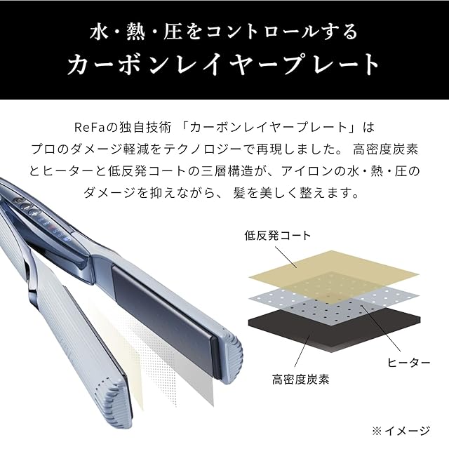 【低反発コートが圧を吸収して髪をつぶさない】カーボンレイヤープレートの表面に施した低反発コートが髪にやさしく密着。髪をつぶさず、なめらかに通すことができます。