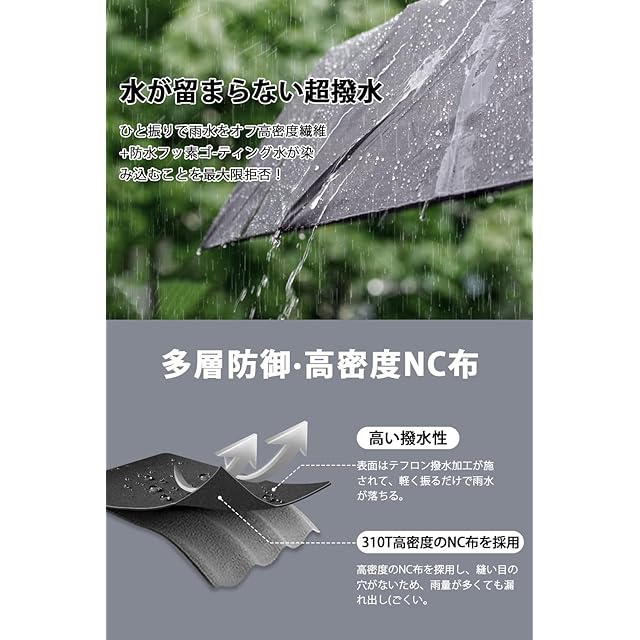 ☂『超撥水テフロン加工』傘布は高密度のポリエステル素材採用、表面テフロン(Teflon)撥水コーティング施され、豪雨の中でも体が濡れることはありません。携帯便利だから、鞄に常備する事で、とっさのゲリラ豪雨にも対応できます。傘を閉じた後、軽く振るだけで、水滴が簡単に振り払えます。電車内等の公共の場では人にご迷惑を掛けません。また防汚効果もあり、汚れにも強い生地です。