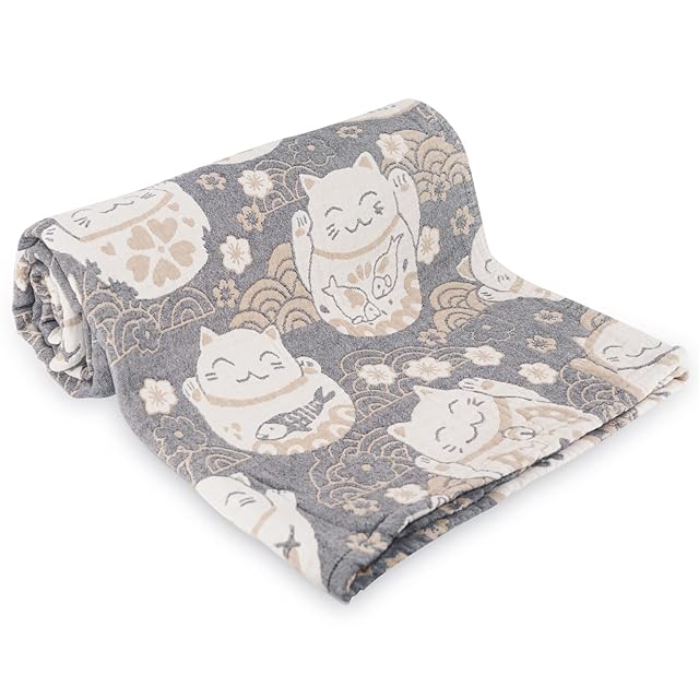 Vanxing ガーゼケット タオルケット シングル セミダブル 綿100% 4重ガーゼ 綿毛布 肌掛け お昼寝 やわらか 吸湿通気 夏快適 洗える150x200cm (招き猫・ブルー)