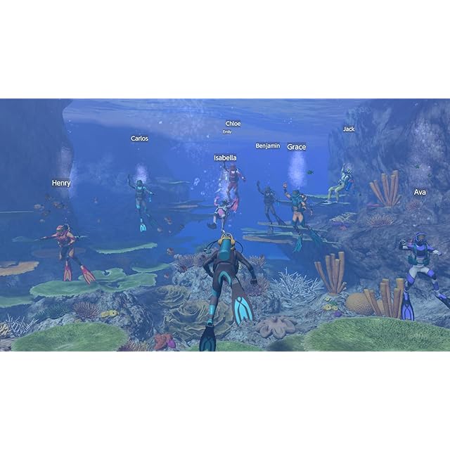 【◆最大30人で、一緒に探索】オンラインに接続すれば、同じ海域を他のダイバーと一緒に探索できます。それぞれが見つけたものを共有したり、ジェスチャーでコミュニケーションをとったりもできます。みんなで同じ場所に向かうもよし、自分のペースで気ままに泳ぐもよし、探索の仕方は人それぞれ自由です。