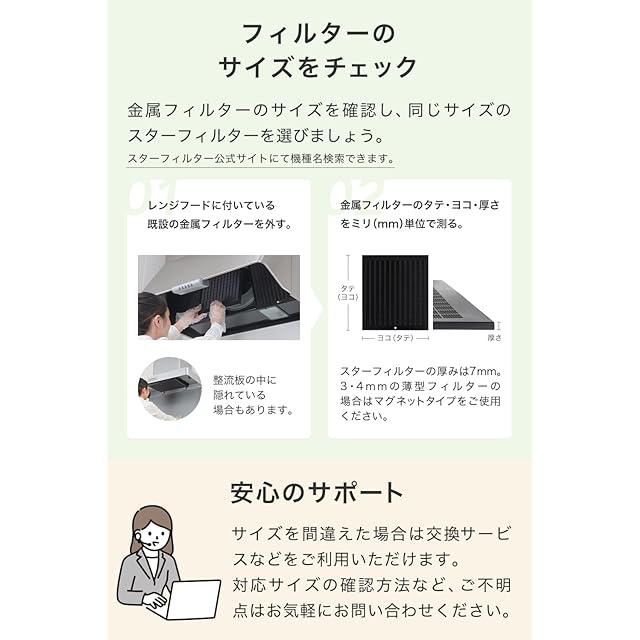 【入れ替えるだけの簡単お手入れ】多くのご家庭のレンジフードに備え付けられている金属フィルターをスターフィルターに取り替えて設置は完了です。これだけで換気扇のきれいが長持ちし、お手入れが劇的にラクに。フィルターレスタイプの場合はマグネットで取り付けられます。