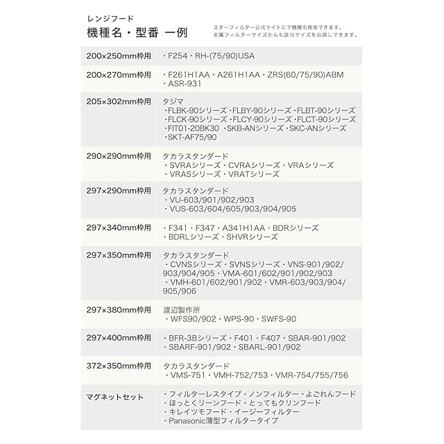 ●297×290mm枠用:タカラスタンダード VU-603/901/902/903、 VUS-603/604/605/903/904/905●297×340mm枠用:F341、F347、A341H1AA、BDRシリーズ、BDRLシリーズ●297×350mm枠用:VNS-902/903/904/905、SVNS-902/903/904/905、VMH-601/901、VMR-905/906●297×400mm枠用:F401、SBAR-901/902、SBARF-901/902、SBARL-901/902●372×350mm枠用:VMH-752/753、VMR-754/755/756●マグネットタイプ:フィルターレスタイプ、ノンフィルター、よごれんフード、ほっとくリーンフード、とってもクリンフード、キレイツモフード、イージーフィルタ
