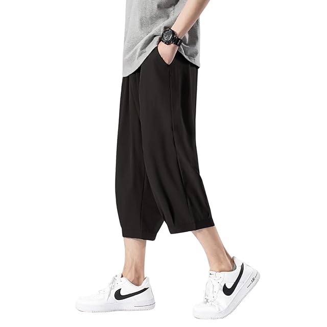 パンツ メンズ 七分丈 夏 接触冷感 クロップドパンツ ハーフパンツ 大きい サイズ ハーレムズボン ワイド ゆったり 涼しい感 アイスシルク ショートパンツ 短パン スポーツ ステテコ black-2XL