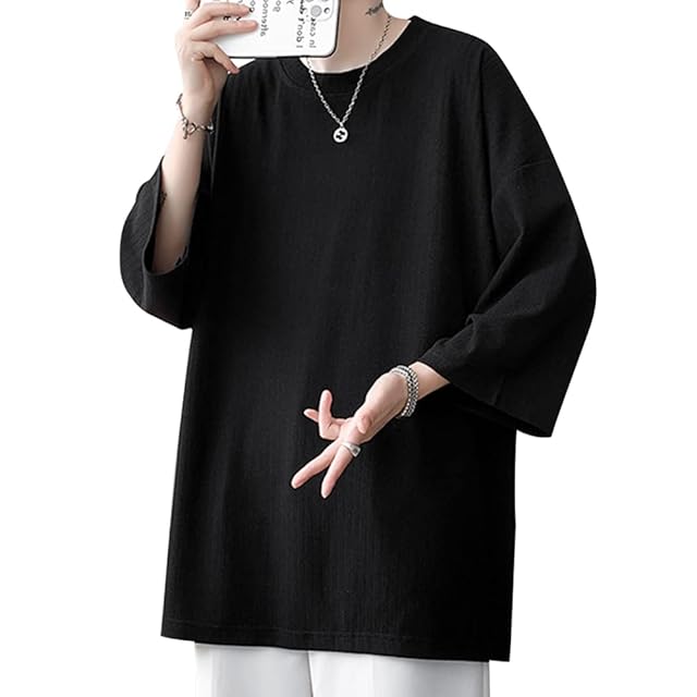 [foveitaa] tシャツ メンズ 夏服 七分袖 おおきい サイズ 涼しい ゆったり かっこいい ビッグシルエット なつふく ストリート 人気 シンプル オシャレ 人気 無地 韓国風ファッション カジュアル トップス 柔らかい肌触り 洋服 軽い 柔らかい Black-L